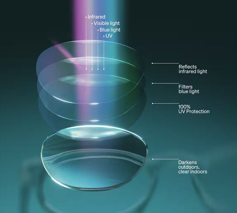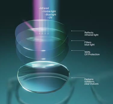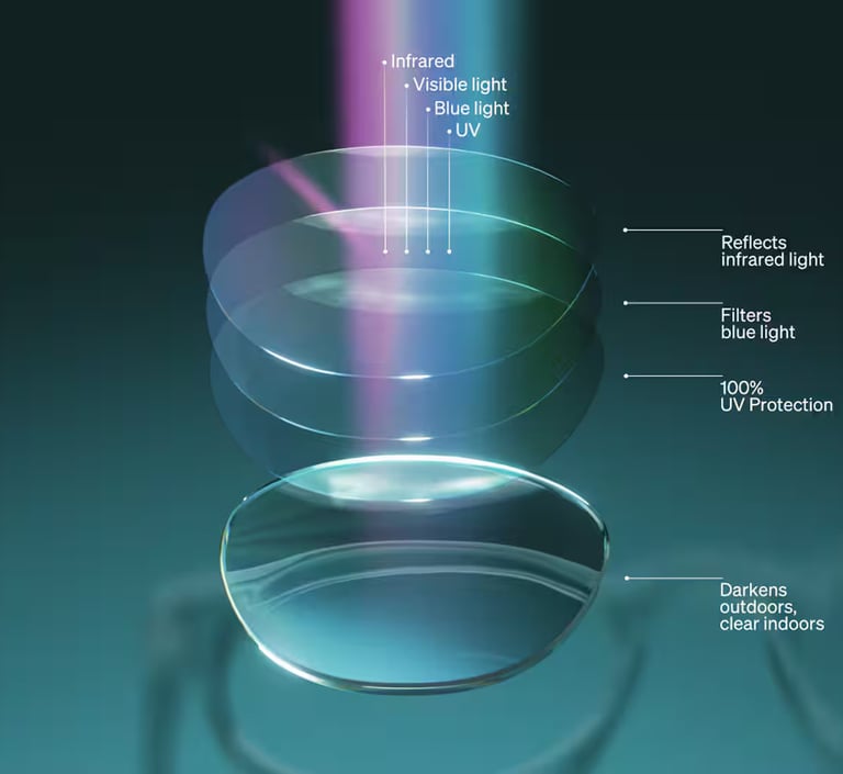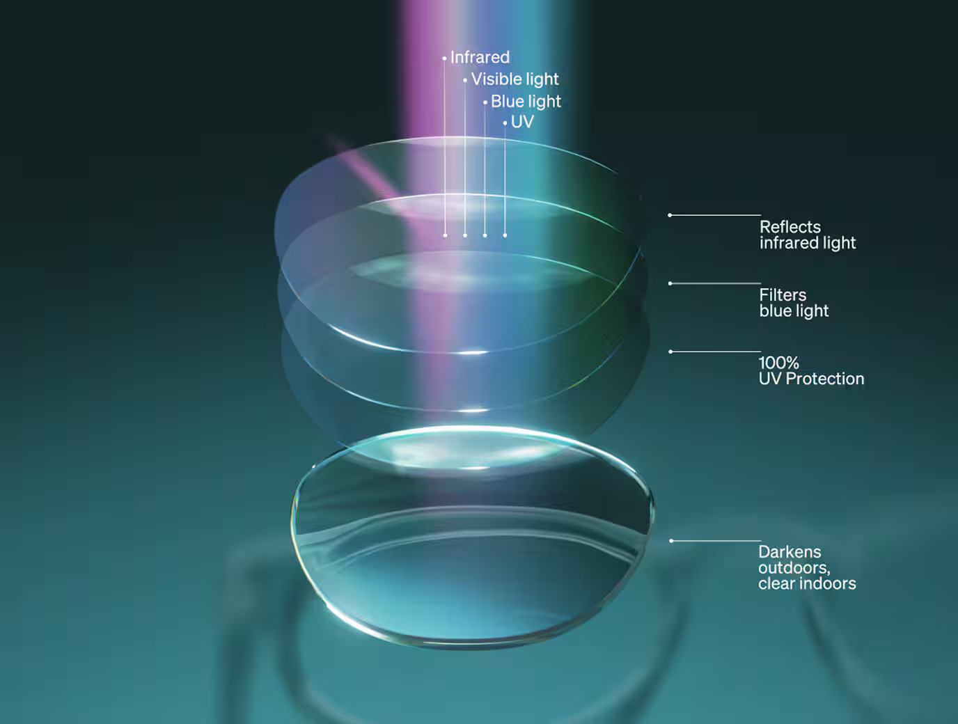 All-in-one defense across the light spectrum —reflects near-infrared light, filters blue light, blocks 100% UV rays, and is light-adaptive for all-day comfort.